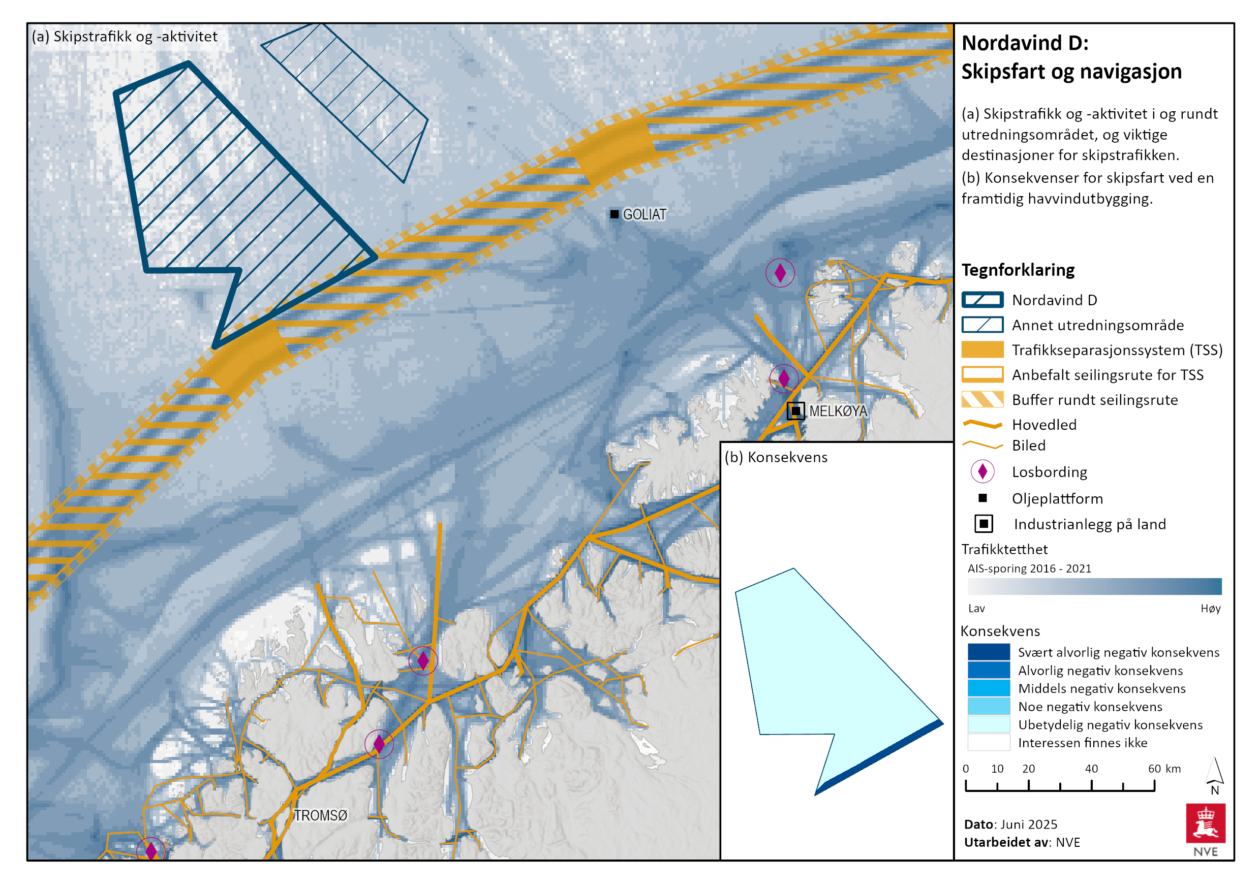 Skipstrafikken i Nordavind D vurderes å være lokalt viktig. Utbygging av havvind i Nordavind D antas å ha ubetydelig konsekvens for skipstrafikken i området. Videre anbefales en buffersone for å sikre fremkommelighet for trafikken som passerer i TSS sør for Nordavind D. Den foreslåtte buffersonen er gitt konsekvensgraden svært alvorlig. Denne konsekvensgraden gjelder aktivitet på overflaten, og området innenfor buffersonen er derfor tilgjengelig for forankringssystemer som går dypere enn 25 meter.