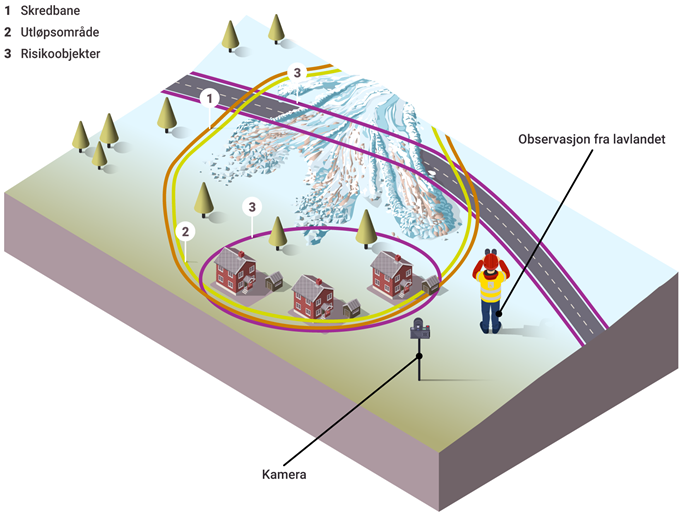 Man skiller på enkle observasjoner i lavlandet, som oftest er visuelle og utføres fra objektet eller i dess nærhet (Figur 6). Det kan være observasjon av snøhøyde på plate, lokale værforhold, skredaktivitet og -avsetninger, bilder opp mot fjellsiden o.l. Disse observasjonene kan mange ganger utføres av ukvalifisert personell, og kan noen ganger erstattes med instrumentering. Observasjoner fra lavlandet kan gi mye relevant informasjon, og observatør er ofte et knutepunkt i lokalmiljøet. En lokal kontakt er viktig for tilliten til varslingen.
