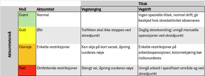 Beredskapsplanen vil videre koble aktsomhetsnivå til de risikoreduserende tiltak som risikoeier beskriver i beredskapsplanen og som anbefales gjennomført ved de ulike nivåene.