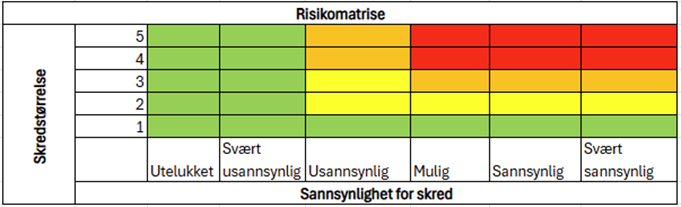 Risikoeier har ansvar for å oppsummere risikoaksepten for hver tiltakssone, f. eks. i en risikomatrise. Denne bør minimum være basert på konsekvens og sannsynlighet for skred og matrisen skal tydeliggjøre graden og konsekvensen av usikkerhet knyttet til vurderingene. Risikoeier bestemmer terskelverdiene som indikerer tiltak, men trenger ofte bistand fra fagpersoner til å gjøre vurderingen. Tersklene kan bestå av «skredstørrelse» og «sannsynlighet for skred», «løsnesannsynlighet» og «sannsynlighet at skred når objekt» eller tilsvarende, se eksempel Figur 2. Matrisen skal presenteres i snøskredvarslingsplanen og brukes både i planleggingsfasen og underveis i varslingssesongen. Risikomatrisen er en modell og kan overstyres.