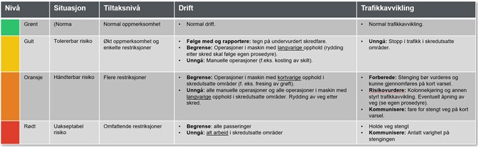 Tabell 2 viser en beredskapsplan for veg med fire aktsomhetsnivåer. Hvert nivå har egne anbefalte tiltak som skal redusere risiko ved trafikkavvikling og drift av veg.